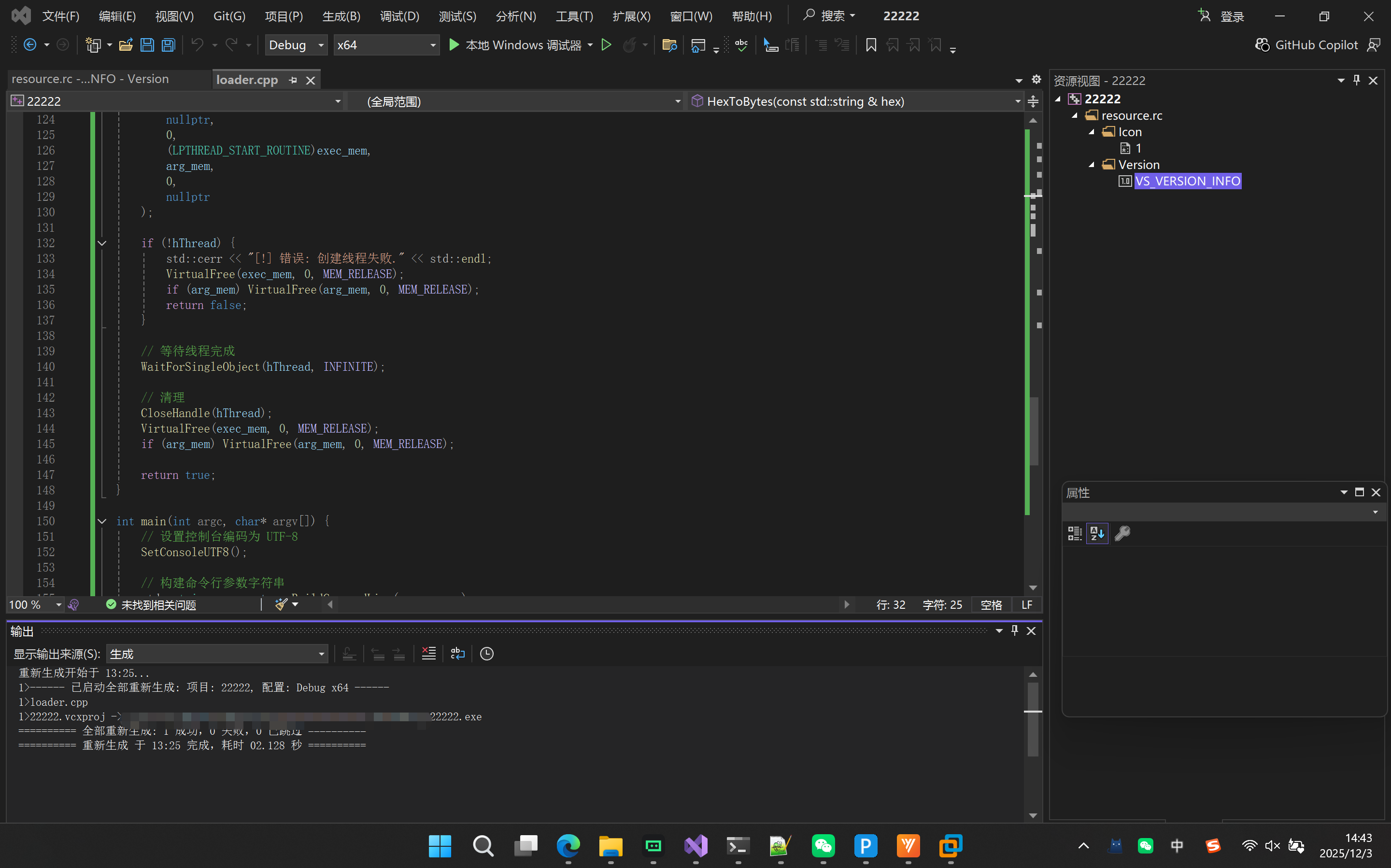 生成完毕后,写一段用c++编写的加载器代码,直接用AI生成,bug自己再微调下,代码功能主要是读取同目录下data.hex文件并加载hex编码到内存中,如果运行该加载器的时,程序在不带参数运行时直接执行 data.hex 文件中的代码,带参数运行时则将参数传递给 data.hex 文件中的代码执行。