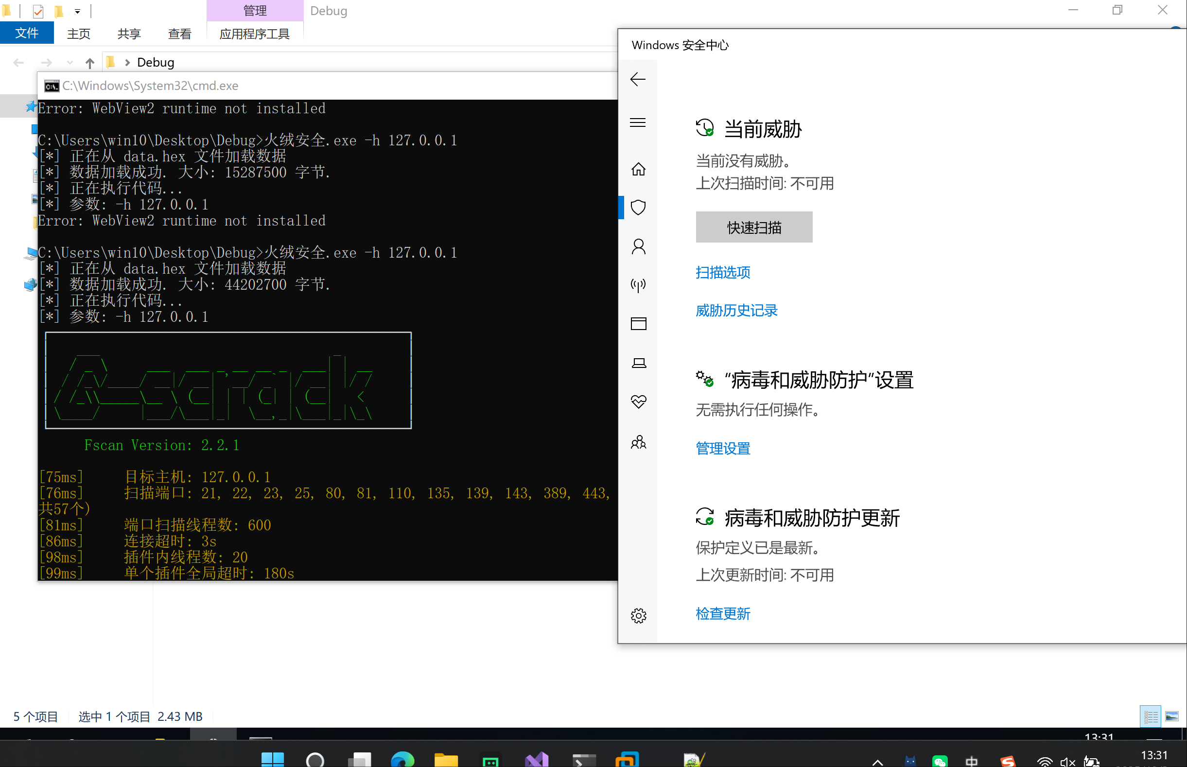 试试fscan,给加载器传参数 -h 127.0.0.1,下面的杀软没问题。