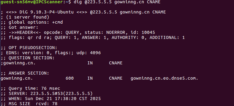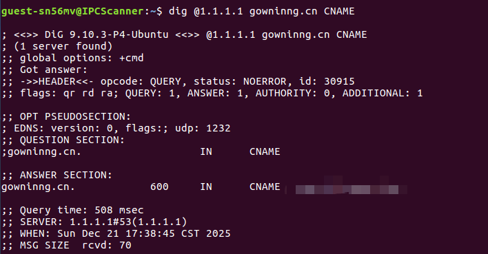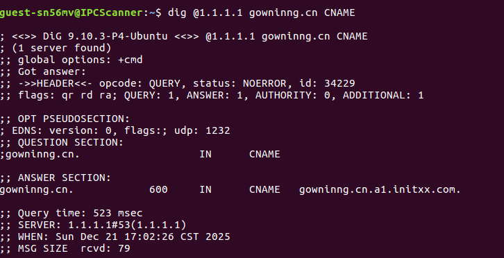 现在使用dig命令测试是否分流成功,分别使用阿里dns、Cloudflare dns和谷歌dns,如下图所示,已经成功分流。