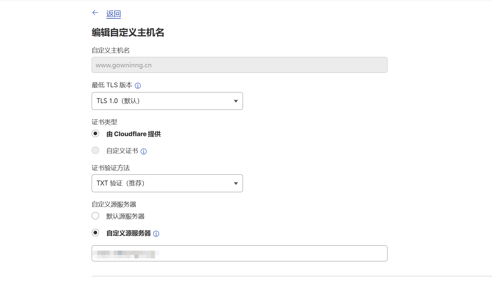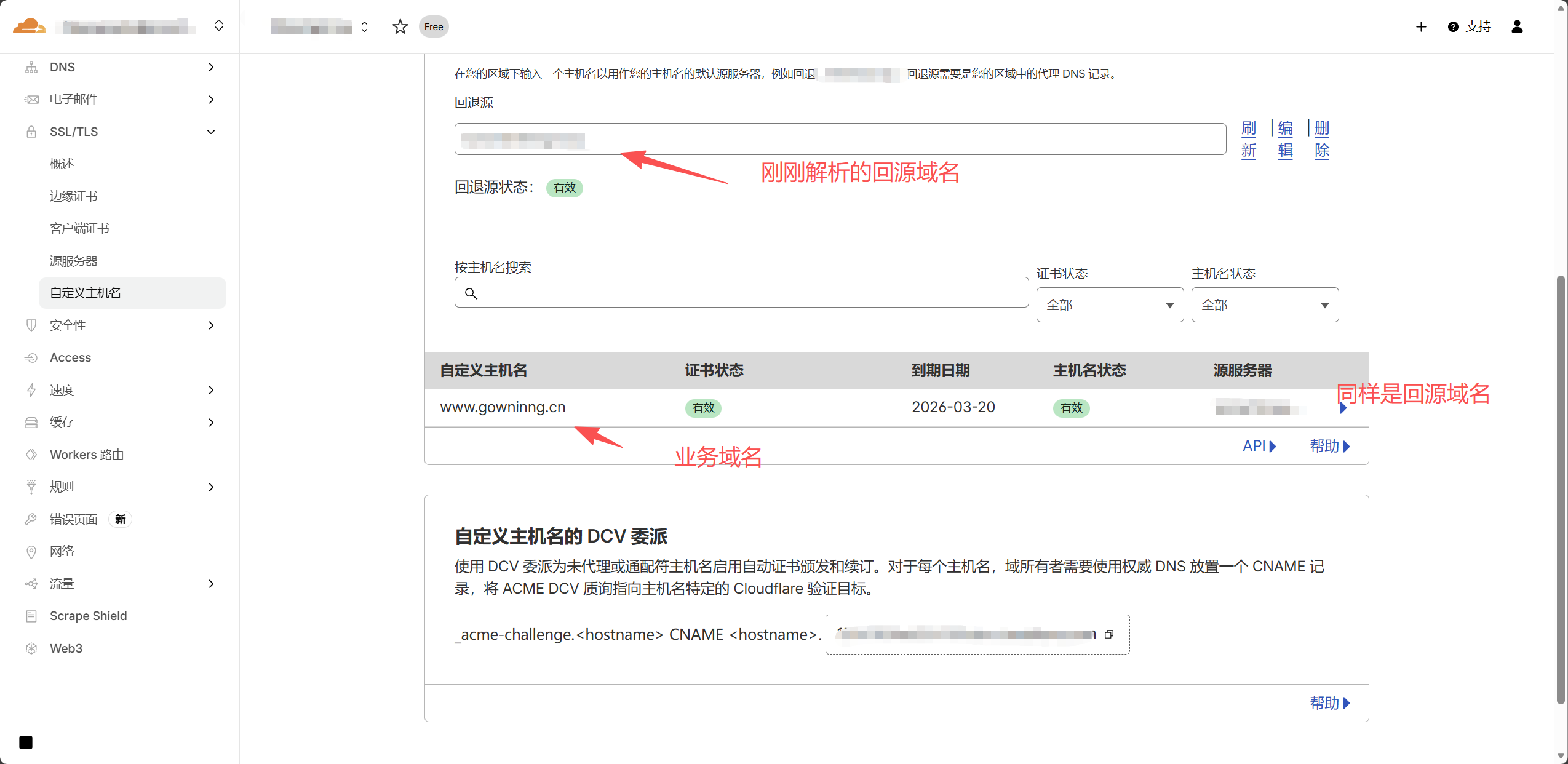 然后点击SSL/TLS中的自定义主机名选项,自定义主机名功能要绑定信用卡订阅该功能,该功能有100免费额度,绑定后开通功能,将回退源填写回源域名,自定义主机名填写业务域名,源服务器同样是回源域名。