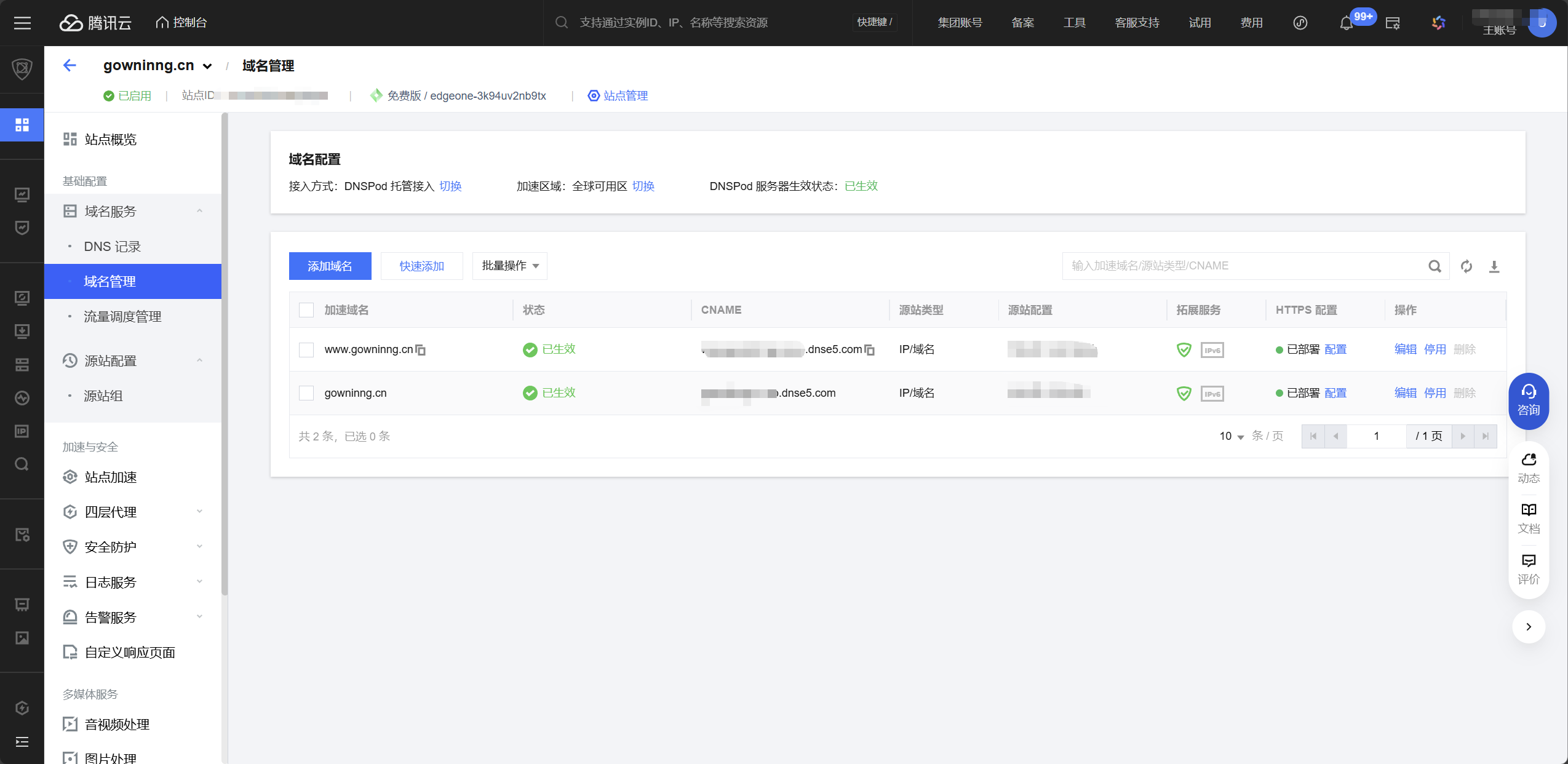 先不管cf,首先先将域名在eo和esa中添加上去,并且在国内dns服务商上面添加cname解析。