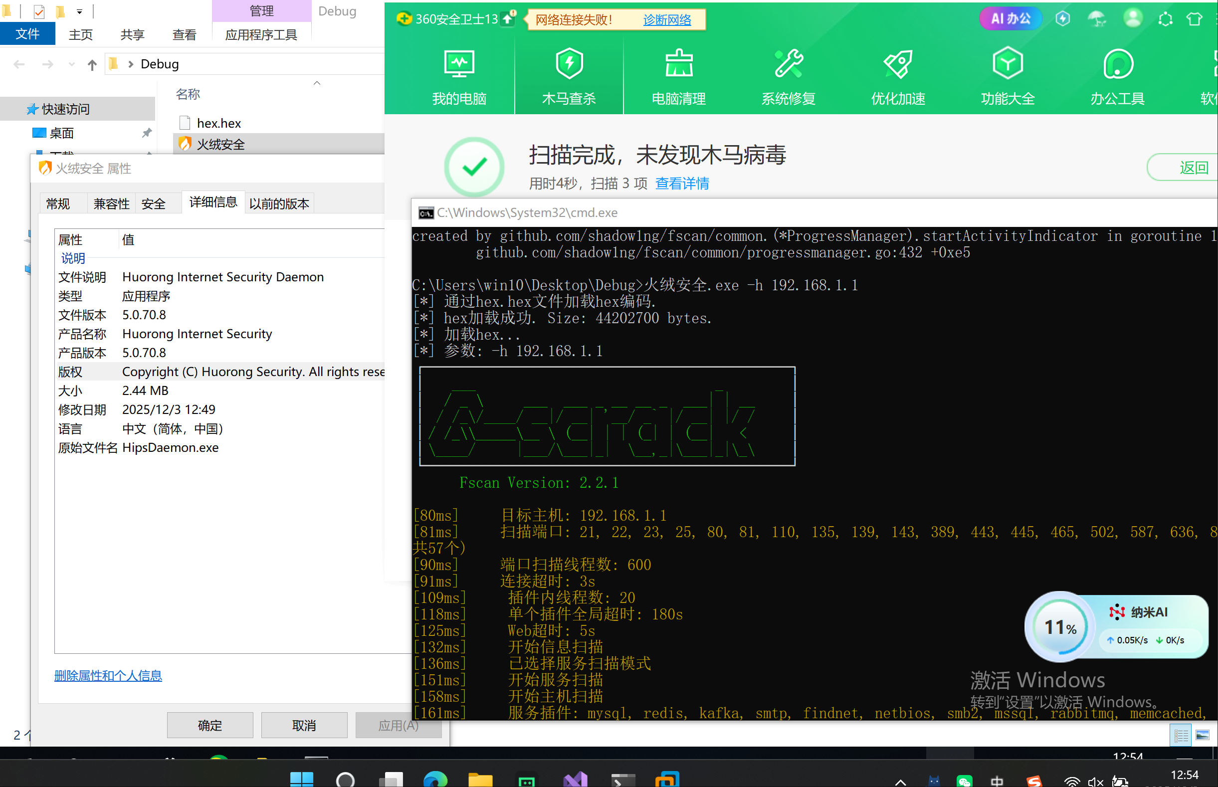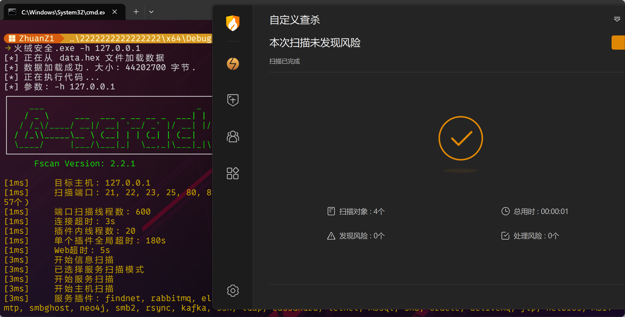 试试fscan,给加载器传参数 -h 127.0.0.1,下面的杀软没问题。