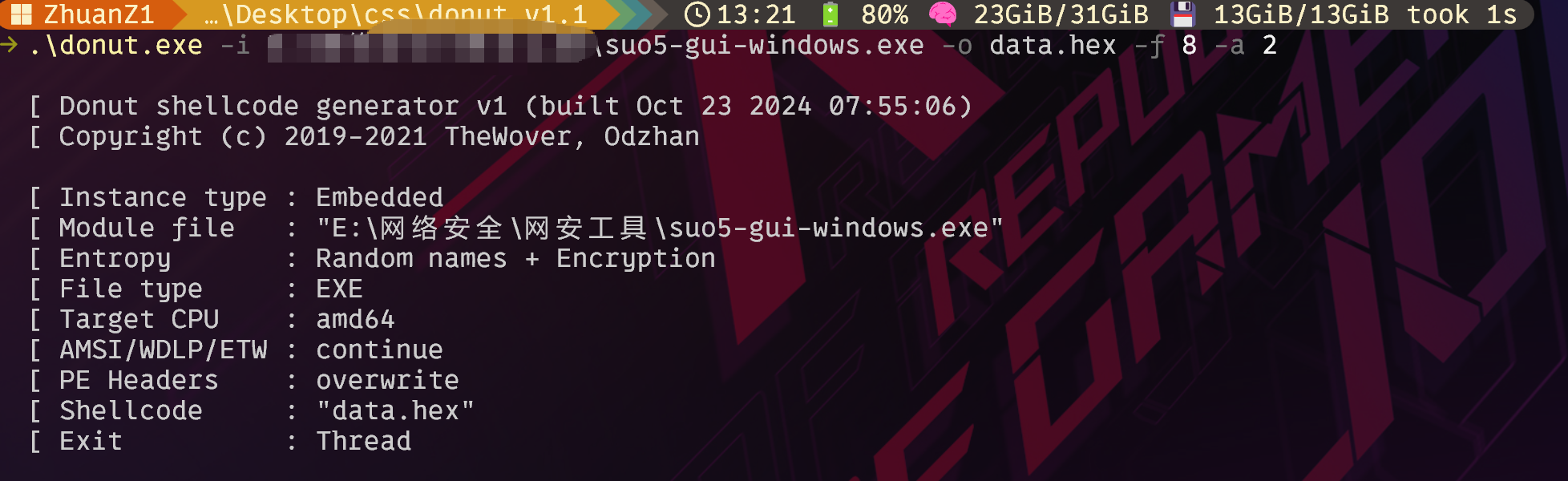 .\donut.exe -i suo5-gui-windows.exe -o data.hex -f 8 -a 2