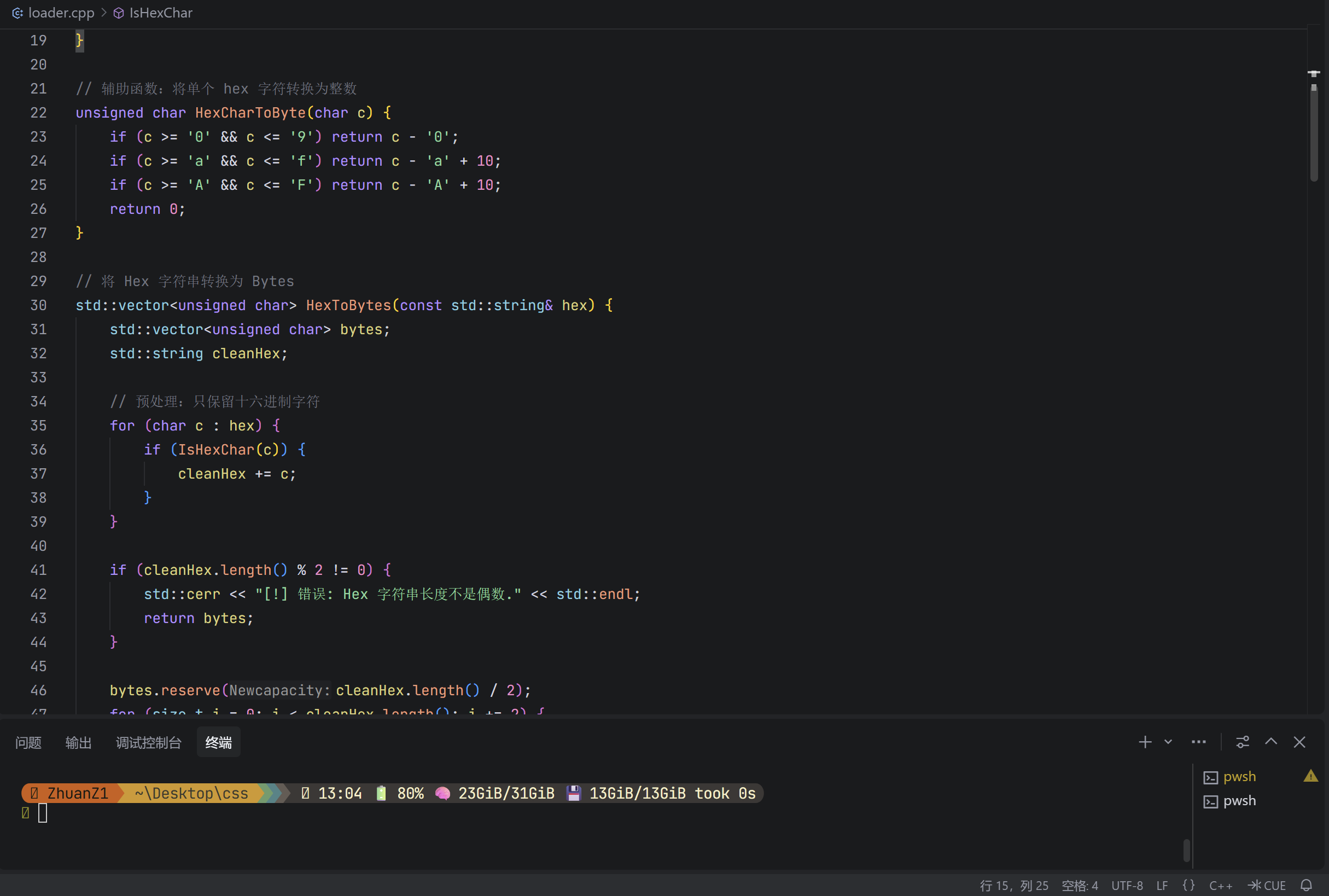 生成完毕后,写一段用c++编写的加载器代码,直接用AI生成,bug自己再微调下,代码功能主要是读取同目录下data.hex文件并加载hex编码到内存中,如果运行该加载器的时,程序在不带参数运行时直接执行 data.hex 文件中的代码,带参数运行时则将参数传递给 data.hex 文件中的代码执行。
